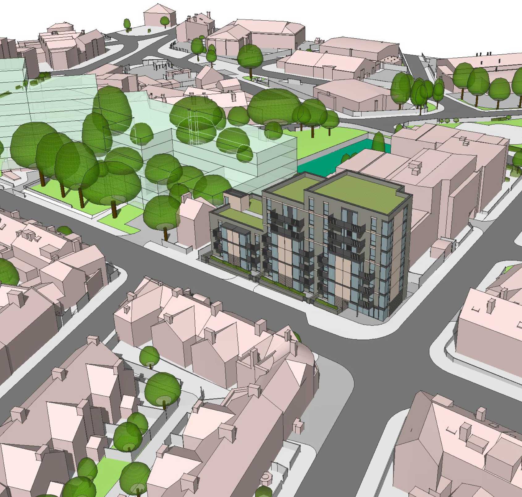 Our plan includes 1-bed/2-person and 2-bed/4-person apartments, spanning 3 to 7 storeys. The development will feature communal roof gardens, oriel windows for privacy, and green construction methods.