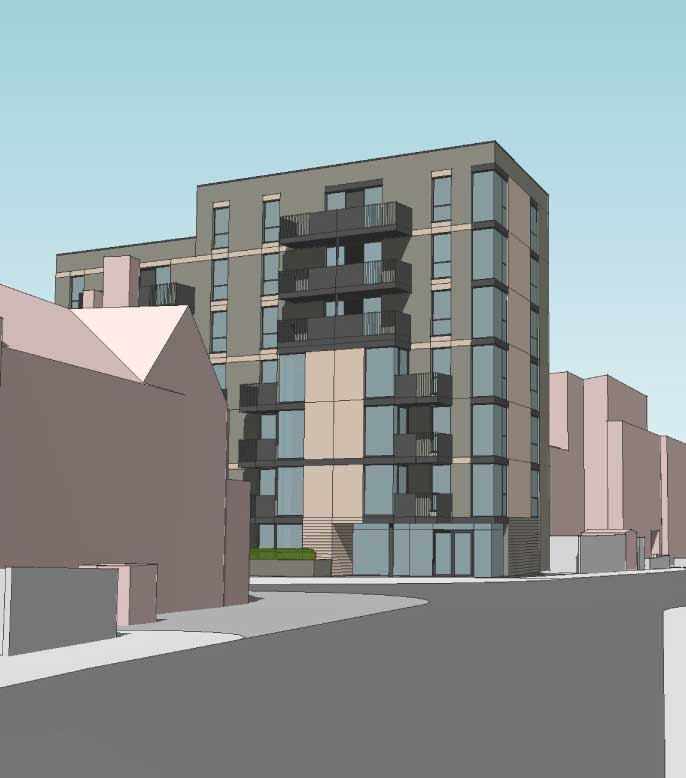 The development will feature primarily facing brickwork with horizontal banding detail, vertical format, full-height windows in color-coated aluminum, and balconies with matching flat bar balustrading.